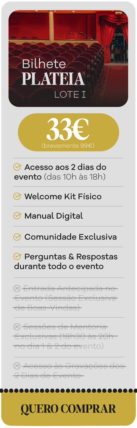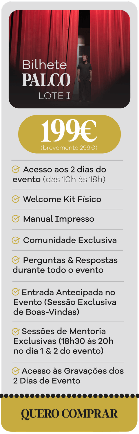 Serão 2 dias imersivos de onde vais sair com um plano completo e com ferramentas práticas para te destacares no mercado, criares produtos bestsellers e estratégias diferenciadoras de previsibilidade para o teu negócio.